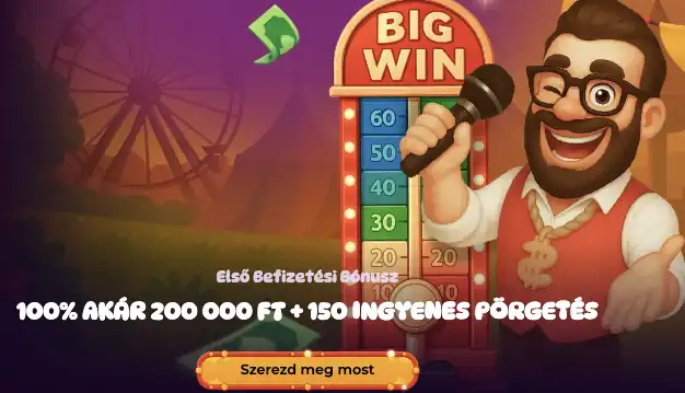 Az első befizetés 100%-a, legfeljebb 500 € bónuszként, plusz 150 ingyenes pörgetés (3 × 50/nap). Minimum befizetés: 15 €, fogadási követelmény: 40x, érvényesség: 7 nap.