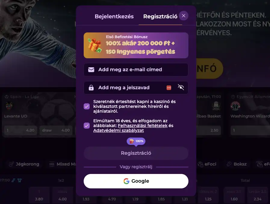 Magasabb befizetésekhez: minimum 300 € befizetés szükséges, a fogadási követelmény 35x. Aktiváláshoz használja az 50HIGH promóciós kódot a Pénztárban.